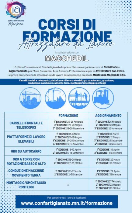 Sono molte le date disponibili per permettere a lavoratori e aziende di pianificare al meglio la formazione obbligatoria. macchedil è orgogliosa di essere stata scelta da Confartigianato Mantova come sede formativa per lo svolgimento dei moduli pratici. Da sempre punto di riferimento per il settore, Confartigianato svolge un ruolo fondamentale di supporto ad artigiani e imprese del territorio, e la formazione rappresenta uno degli ambiti strategici del suo impegno. La collaborazione con macchedil rafforza una sinergia costruita sulla qualità didattica, sull’esperienza tecnica e sull’attenzione concreta alla sicurezza nei luoghi di lavoro.