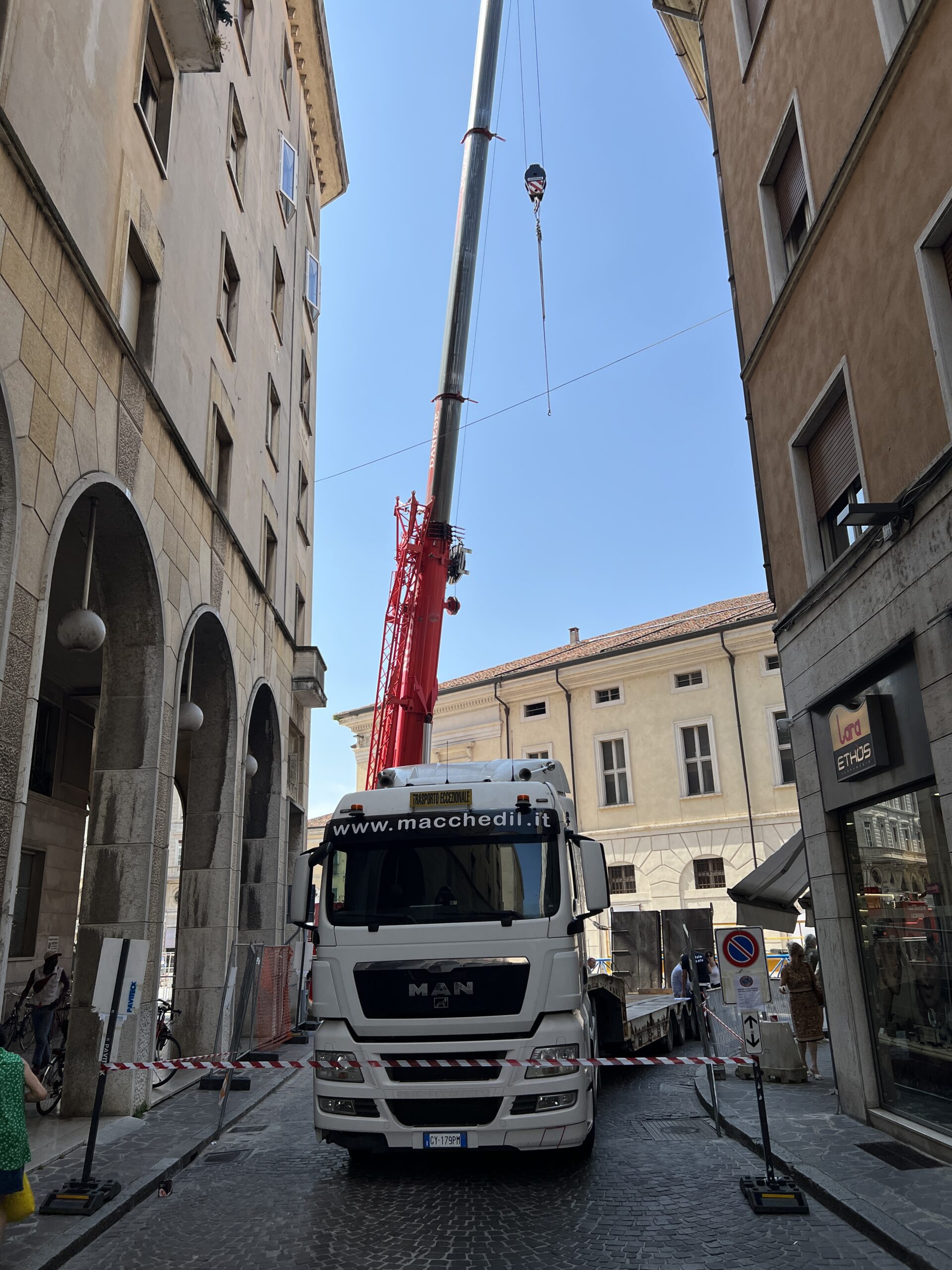 Progettare questo servizio ha coinvolto diversi elementi, quello più critico è stato sicuramente quello riguardante la viabilità, infatti il percorso studiato ha previsto la rimozione temporanea di alcuni elementi di arredo urbano e ha costretto i nostri autisti a cimentarsi in manovre molto complesse per raggiungere il punto di installazione. Questa situazione si è resa necessaria per la presenza un un altro cantiere attivo nelle vicinanze, quello appunto della limitrofa nuova Piazza Cavallotti.