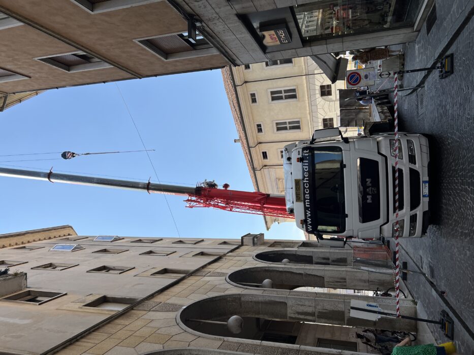 Progettare questo servizio ha coinvolto diversi elementi, quello più critico è stato sicuramente quello riguardante la viabilità, infatti il percorso studiato ha previsto la rimozione temporanea di alcuni elementi di arredo urbano e ha costretto i nostri autisti a cimentarsi in manovre molto complesse per raggiungere il punto di installazione. Questa situazione si è resa necessaria per la presenza un un altro cantiere attivo nelle vicinanze, quello appunto della limitrofa nuova Piazza Cavallotti.