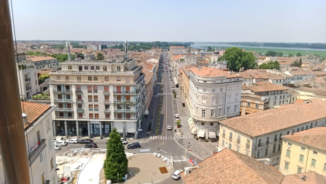 Da questa immagine si può avere un punto di vista non comune di Piazza Cavallotti e Corso Vittorio Emanuele II dall’altezza di 36 metri con lo scorcio del lago Superiore sulla destra.