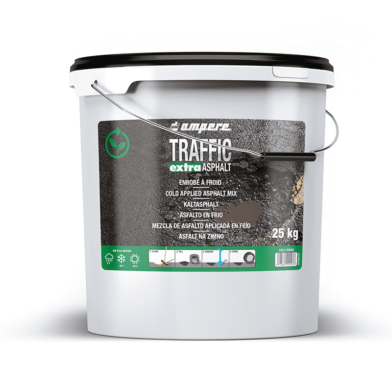 Pulire il buco con cura, riempirlo completamente con AMPERE TRAFFIC ASPHALT, facendo fuoriuscire dai bordi. Premere con un compattatore manuale o col dorso di una pala o ancora con l’ausilio di un rullo da giardino o un rullo di tipo lavori pubblici; la circolazione potrà riprendere immediatamente. Raccomandazioni per la compattazione: