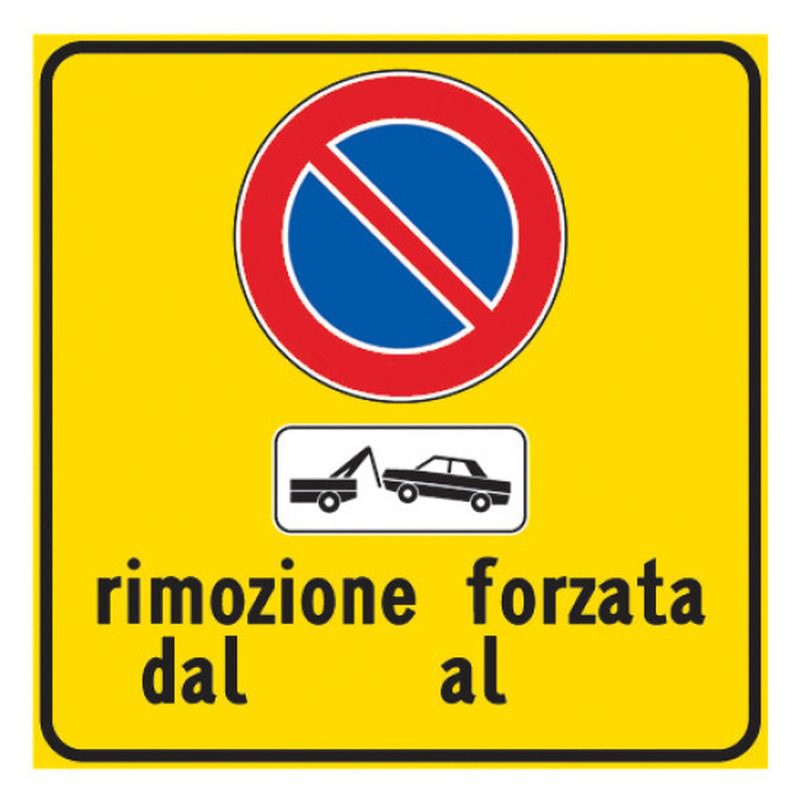 Il cartello da cantiere “Rimozione Forzata dal … al …” – Figura 521 è un segnale di segnaletica stradale temporanea utilizzato per indicare il divieto di sosta con rimozione forzata in un intervallo di tempo specifico, tipicamente in presenza di cantieri stradali, manutenzioni, lavori pubblici o occupazioni temporanee della carreggiata.
