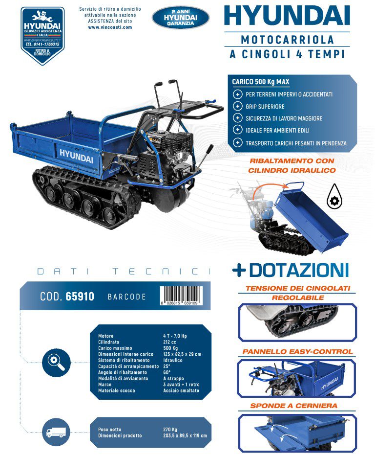 La motocarriola cingolata Hyundai è progettata per affrontare terreni accidentati e pendenze impegnative, rendendola ideale per edilizia, agricoltura e giardinaggio. Dotata di un motore a benzina 4 tempi da 5 kW (7 HP) e cilindrata 212 cc, assicura elevate prestazioni e affidabilità nel trasporto di materiali pesanti, legna, detriti e attrezzature da lavoro.