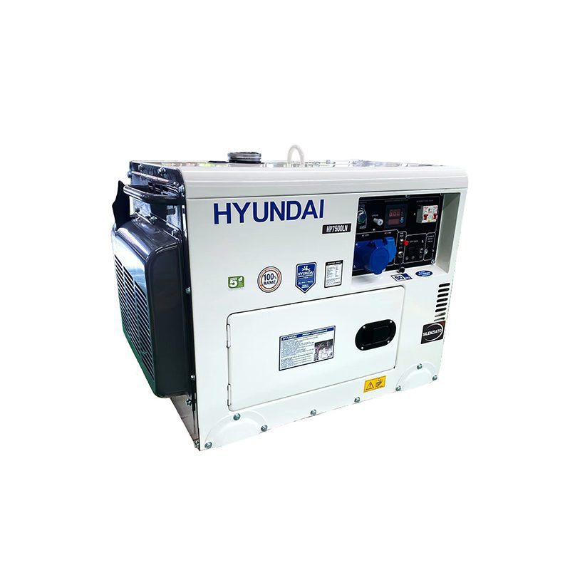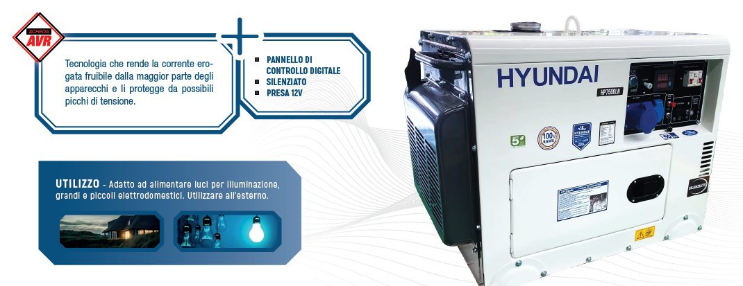 Generatore diesel Hyundai monofase da 12 HP, potenza nominale 6,0 kW (max 6,3 kW) con alternatore 100% rame e regolazione AVR. Avviamento elettrico, autonomia fino a 7,5 h con serbatoio da 14,5 L, rumorosità 72 dB a 7 m. Dotato di pannello digitale 5 funzioni, prese 1x16A + 1x32A, presa 12V e batteria da 30 Ah.