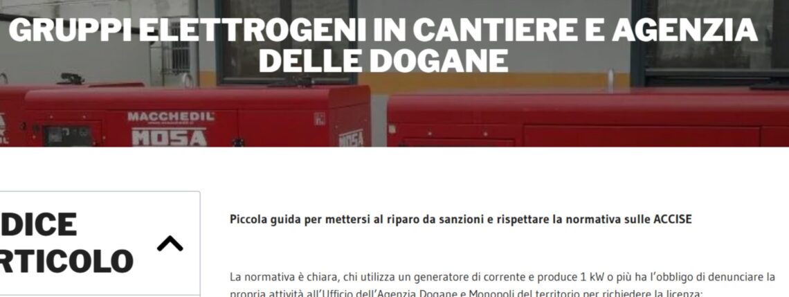 Se utilizzi un gruppo elettrogeno nel tuo cantiere hai l’obbligo di denunciare preventivamente la tua attività all’Ufficio AGENZIA DELLE DOGANE E MONOPOLI del territorio in modo da ottenere la prescritta licenza.