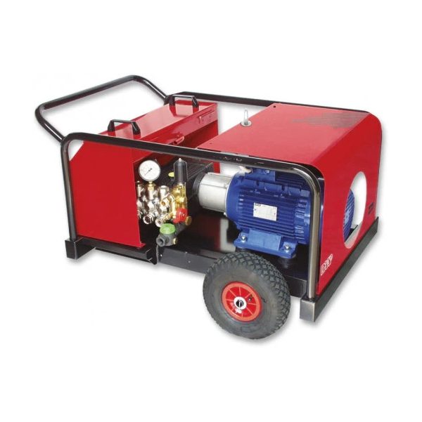 La macchina è equipaggiata con motore elettrico trifase 380V da 7,5kW (10HP) che garantisce prestazioni elevate e continuità operativa anche nei lavori più impegnativi. Grazie alla pressione massima di 250bar e alla portata di 900L/h, offre un flusso potente adatto a cantieri, manutenzioni industriali e trattamenti di superfici esterne.