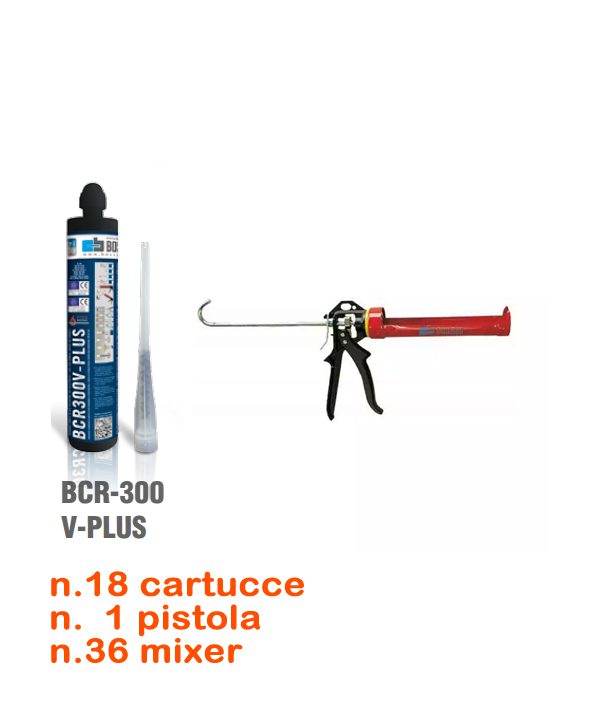 Secchio contenente un kit di 18 cartucce sacchetto di ancorante chimico Bossong da 300 ml V PLUS, n. 1 pistola dosatrice e 36 mixer.